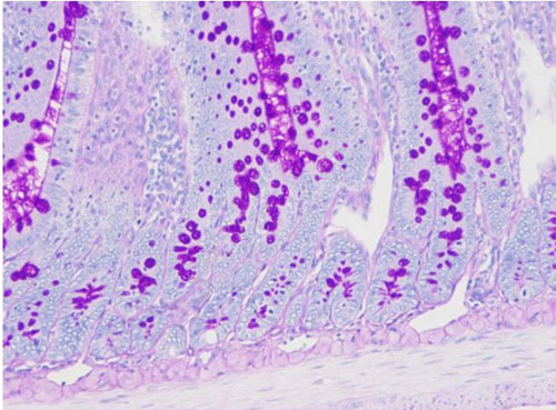 PAS染色又稱過(guò)碘酸雪夫染色,糖原染色。一般用來(lái)顯示糖元和其它多糖物質(zhì)。過(guò)碘酸能使細(xì)胞內(nèi)的多糖乙二醇基氧化成二醛,再與Schiff氏液的無(wú)色品紅結(jié)合,紅色,定位于胞漿上