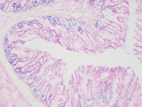 β-半乳糖甘酶染色,衰老細(xì)胞通常體積變會(huì)大,表達(dá)pH6.0時(shí)有高酶活性的β-半乳糖苷酶。染色中以X-ga1(5-溴-4-氯-3-吲哚-β-D-半乳糖苷)為底物,在衰老特異性的β-半乳糖苷酶催化下,半乳糖苷鍵被水解生成深藍(lán)色產(chǎn)物,光學(xué)顯微鏡下很容易觀察到變成藍(lán)色的表達(dá)β-半乳糖苷酶的細(xì)胞或組織。
