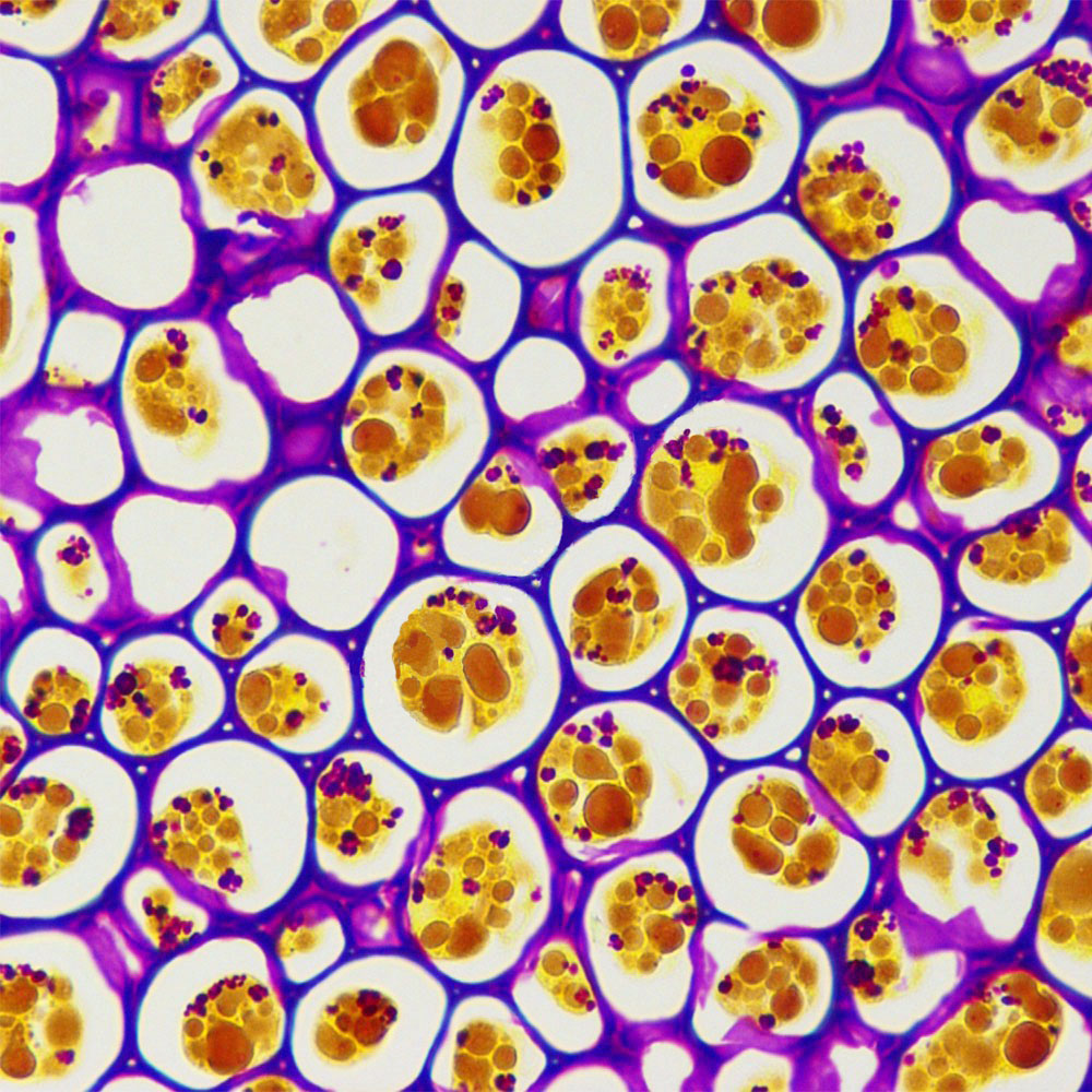 PAS+萘酚黃S染色,石蠟切片技術里用以觀察植物組織中淀粉纖維素等糖類成分的分布,以及一些蛋白的分布和含量的檢測。淀粉粒呈紫紅色顆粒,細胞壁呈紫紅色,蛋白質呈黃色