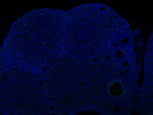 晚期凋亡細胞中染色體DNA雙鏈或單鏈斷裂產生粘性3'-OH末端,在脫氧核糖核苷酸末端轉移酶(TdT)的催化下,將帶有熒光素分子的dUTP標記到DNA的3'-末端,然后通過熒光顯微鏡觀察、或進而用帶有HRP的一抗染色后DAB顯色,可以進行凋亡細胞的檢測,該實驗稱為脫氧核糖核苷酸末端轉移酶介導的缺口末端標記法(terminal-deoxynucleotidyl transferase mediated nick end labeling, TUNEL)。
