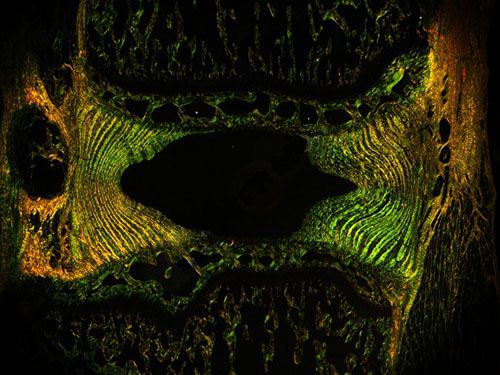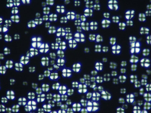 偏振光拍照是利用光的偏振特性對具有雙折射性物質(zhì)進(jìn)行拍照采集圖像。 在生物體中,不同的纖維蛋白結(jié)構(gòu)顯示出明顯的各向異性,使用偏光顯微鏡可得到這些纖維中分子排列的詳細(xì)情況,如膠原蛋白等。雙折射性是晶體的基本特征,因此也被廣泛應(yīng)用在結(jié)石、尿酸晶體等。淀粉樣蛋白的生化成分和來源不盡相同,但在染色和某些物理性狀方面具有許多共同性,可被剛果紅染成磚紅色,偏振光下呈特有的綠色雙折光。下圖就是利用偏振光顯微鏡拍攝的天狼猩紅染色結(jié)果。