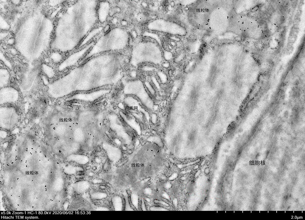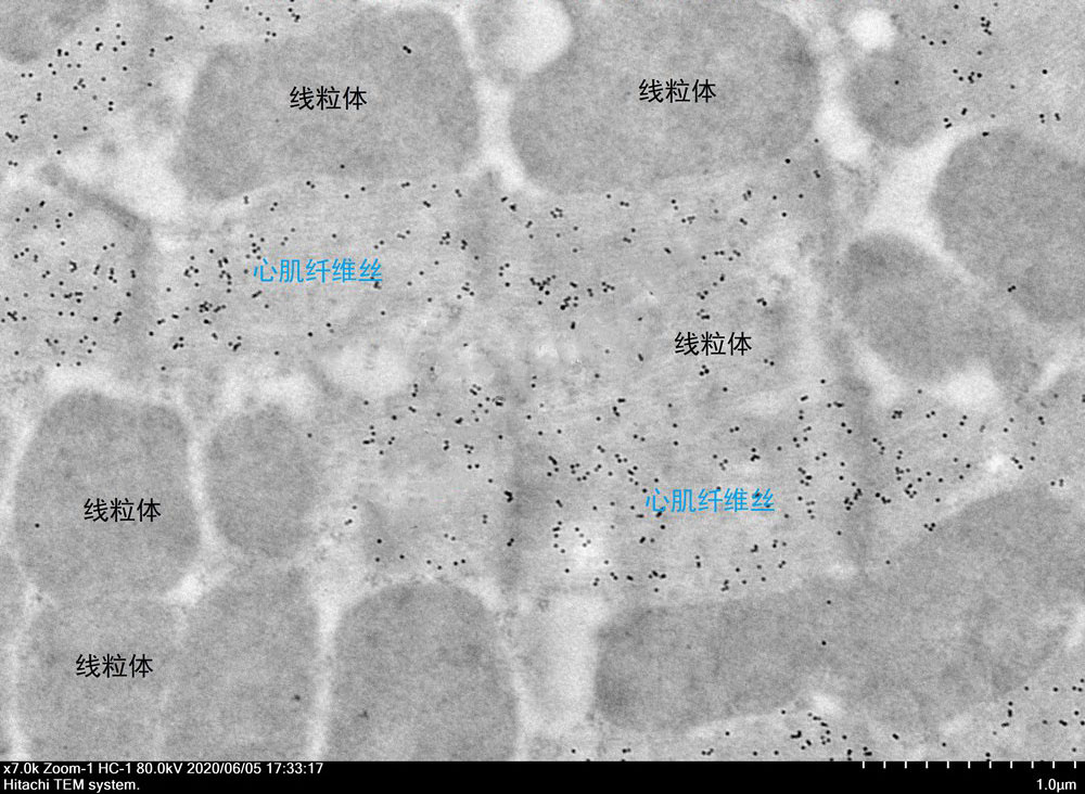 該項技術是組織樣品經低溫脫水滲透LR White樹脂低溫聚合包埋,超薄切片70-80nm,用特異性一抗與待檢測抗原結合然后用帶有膠體金標記的二抗一抗抗原復合物結合,在電子顯微鏡下觀察,由于二抗上的膠體金形成一定的電子密度而精確指示出相應抗原在亞細胞水平上的定位