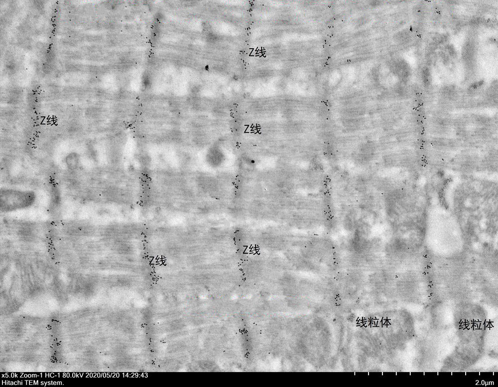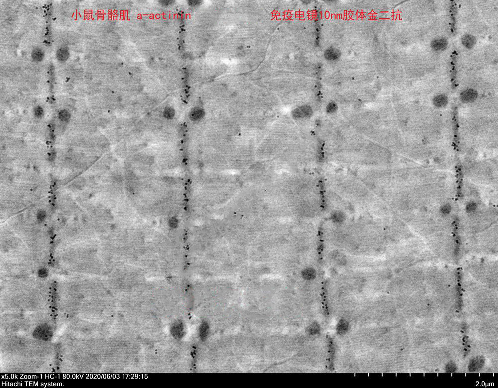該項技術是組織樣品經低溫脫水滲透LR White樹脂低溫聚合包埋,超薄切片70-80nm,用特異性一抗與待檢測抗原結合然后用帶有膠體金標記的二抗與一抗抗原復合物結合,在電子顯微鏡下觀察,由于二抗上的膠體金形成一定的電子密度而精確指示出相應抗原在亞細胞水平上的定位。
