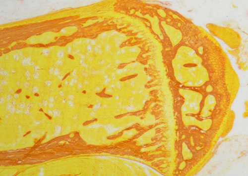 天狼猩紅和KWS都是強酸性染料,易與膠原分子中的堿性基團結合,吸附牢固。偏振光鏡檢查,膠原纖維有正的單軸雙折射光的屬性,與KWS-天狼猩紅結合,可增強雙折射,提高分辨率,從而區分兩型膠原纖維。未脫鈣骨組織切片經天狼猩紅染色后,普通光學顯微鏡下,膠原纖維呈紅色或鮮紅色,其他呈黃色;在偏振光顯微鏡下,Ⅰ型膠原纖維呈強橙黃色或亮紅色,Ⅲ型膠原纖維呈綠色。