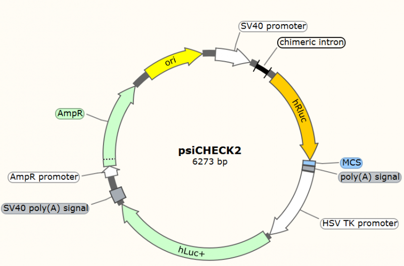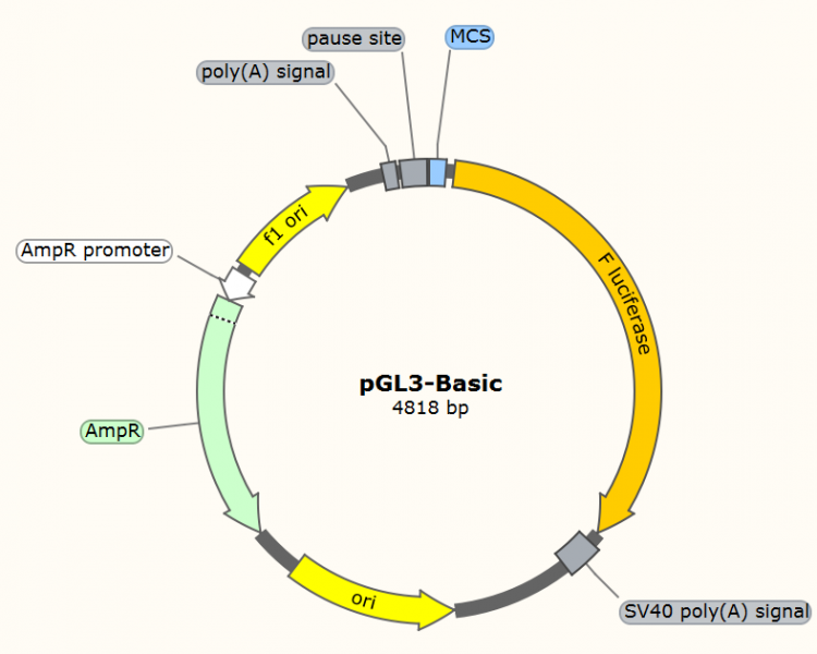 ● pGL3-Basic---用于轉錄因子結合位點與啟動子活性分析。把待分析啟動子區段構建到F-Luciferase上游,和轉錄因子共轉染分析F-Luciferase活性即可反應啟動子的活性高低。該質粒通常需要結合持續性表達R-Luciferase的載體作為內參以校正不同樣品之間轉染的轉染效率(參考案例一)。